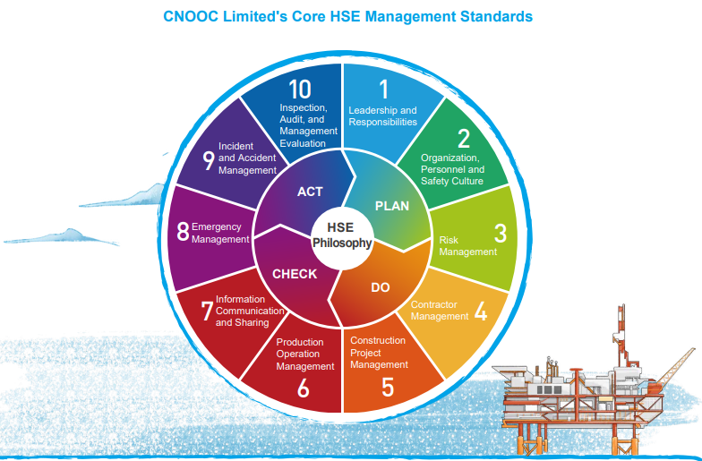 CNOOC Limited places great emphasis on production safety and strictly abides by the Law of the People's Republic of China on Work Safety, the Law of the People's Republic of China on the Protection of Oil and Gas Pipelines, the Regulations on the Safety Production of Offshore Oil, the Rules for the Administration of Offshore Oil Safety, the Safety Rules for Offshore Fixed Platforms and other relevant laws, regulations and industry standards. On the basis of good domestic and international practices and the safety management system standards issued by relevant international organizations, we have established and improved the Company's characteristic HSE management system. The system is deeply integrated with the Company's basic QHSE internal control policy and set clear principles and parameters for safety management.