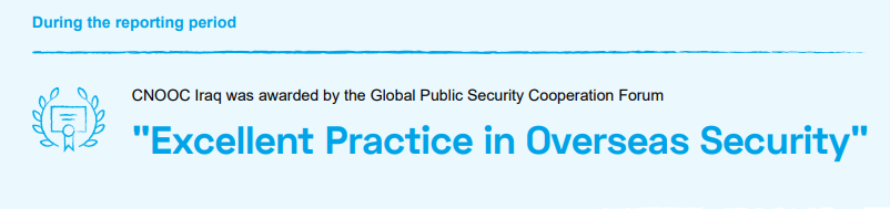 CNOOC Limited has formulated the Overseas Project Safety Management Guidelines to continuously strengthen overseas public safety management. The Company has established a "5+2" overseas public safety management system, striving to build and improve management culture, institutional mechanisms, regulatory standards, foundational research, and informatization. This systematically enhances overseas public safety management capabilities, mitigates major operational safety risks, and fully safeguards the property and lives of overseas employees. In 2024, there was no major public safety accident in overseas units.